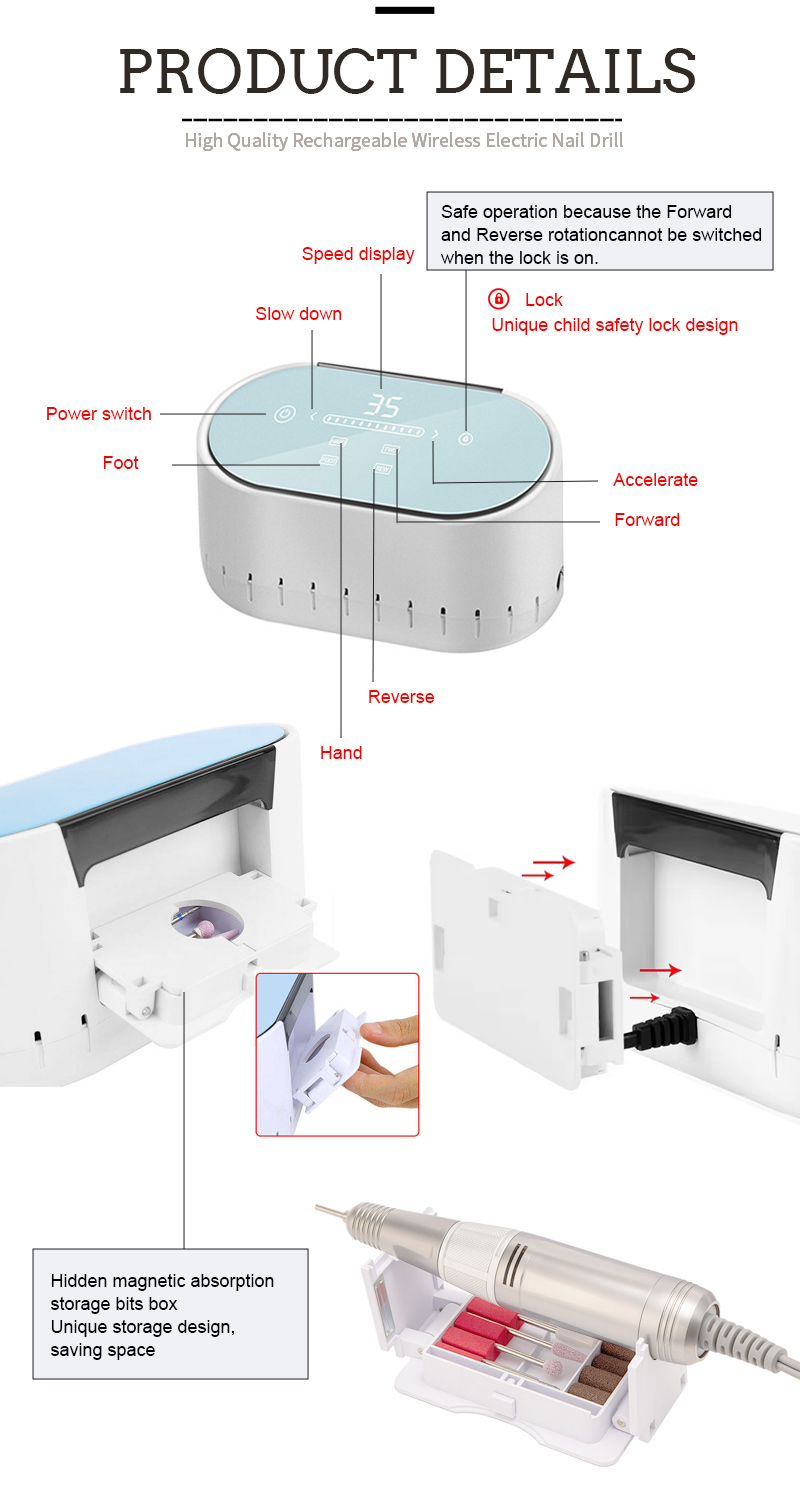 I-Nail Drill Eshajwa Kabusha Isetha Ukubhola Kwezinzipho Ezinzwaneni 35w 35000rpm