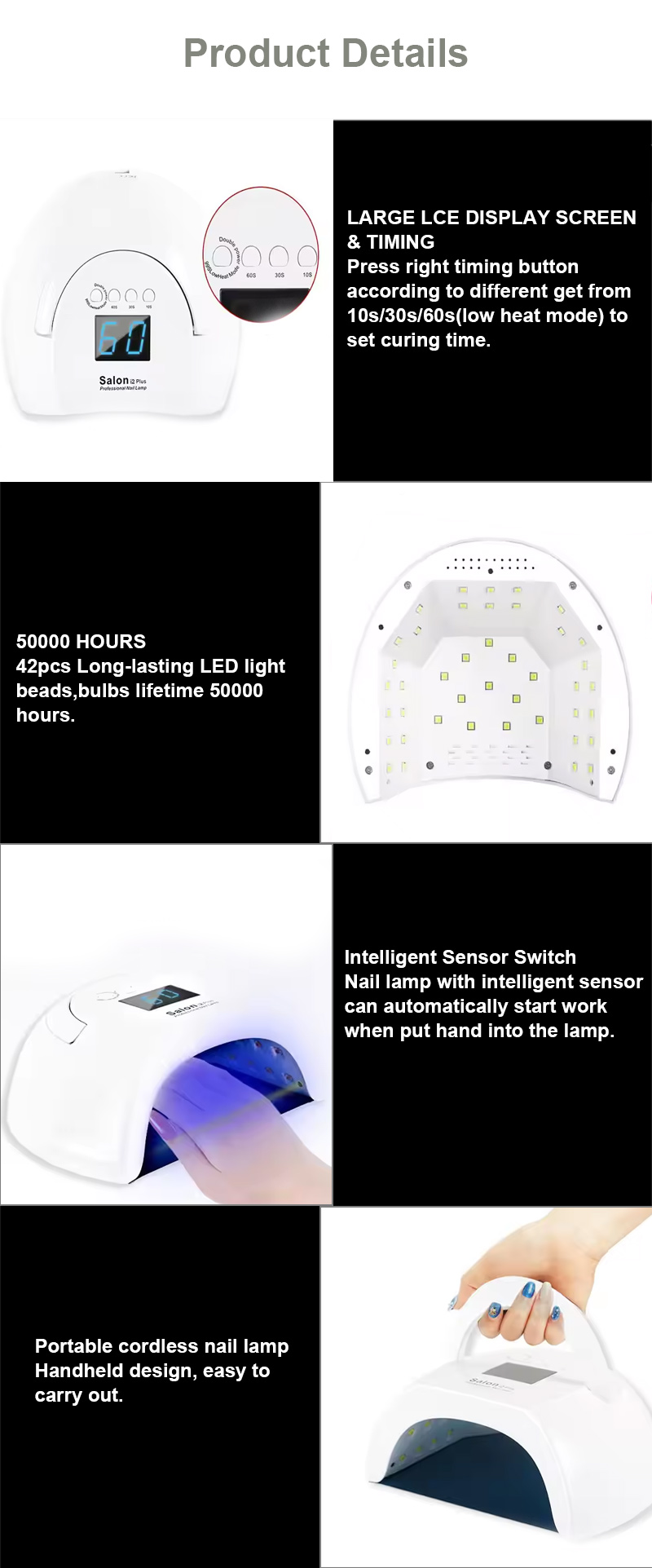 한국어I-Shenzhen Ruina Optoelectronics Co., Ltd., njengomkhiqizi ohamba phambili waseChina, umphakeli, kanye nomthekeli we-Gel Nail Drying Lamp ene-Removable Base Plate, ngokuqhubekayo isekela ifilosofi yokuphishekela ikhwalithi ephelele. Lokhu kuzibophezela kwenze izibani zethu ezinamathelayo ze-UV ezisetshenziswa ekhaya zethenjwa amakhasimende amaningi. Idizayini enhle kakhulu, izinto zokusetshenziswa eziphakeme, ukusebenza okuvelele, namanani ancintisana kakhulu—lokhu yilokho kanye wonke amakhasimende akulindele, kanye nalokho esikulethayo. Kunjalo, isevisi ephelele emva kokuthengisa nayo ibalulekile.