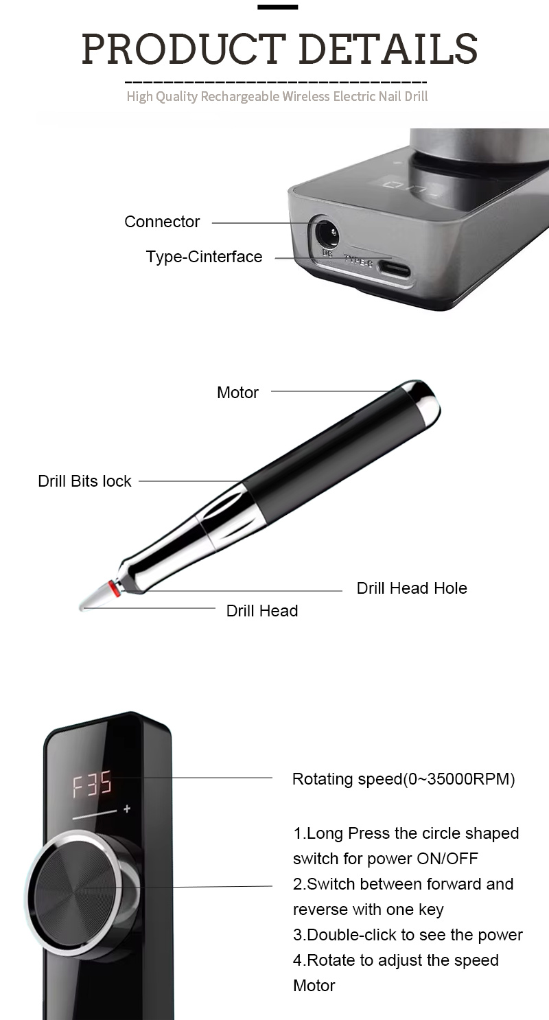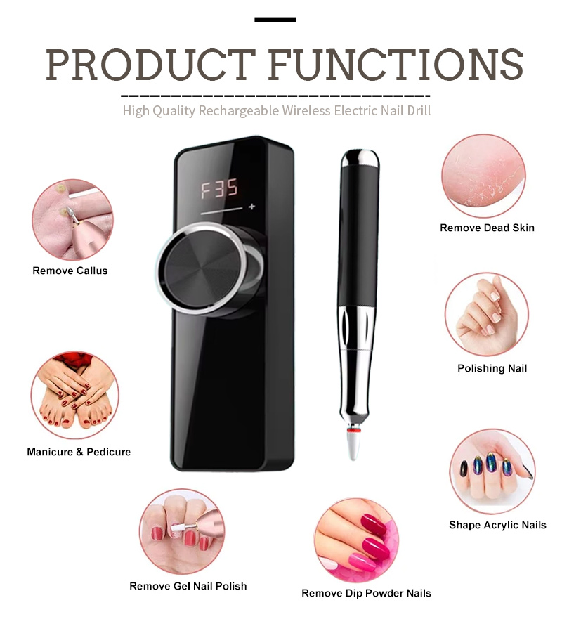 Izici zomkhiqizo kanye nezinhlelo zokusebenza zemodeli engu-109 ephezulu ye-35,000 RPM Electric Nail File FirUS