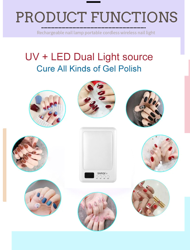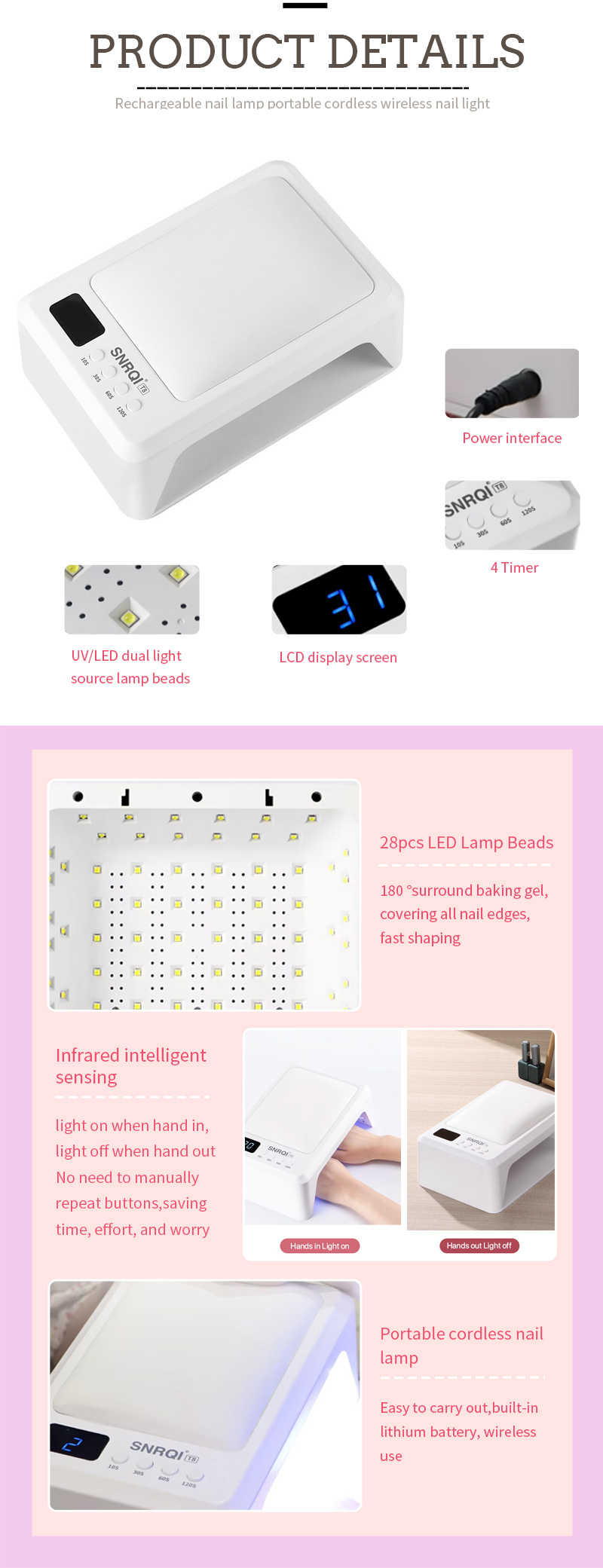 I-Nail Lamp yasePilish Lamp engu-128W ukubukeka komkhiqizo inomklamo we-groove, isibambo esise-groove singasetshenziswa njengendima yokubamba ephathekayo, okwenza kube lula ukuthwala nokubeka. Kubuye kugweme ukungathandeki kwesibambo kuphulwe kalula futhi kwadonswa.