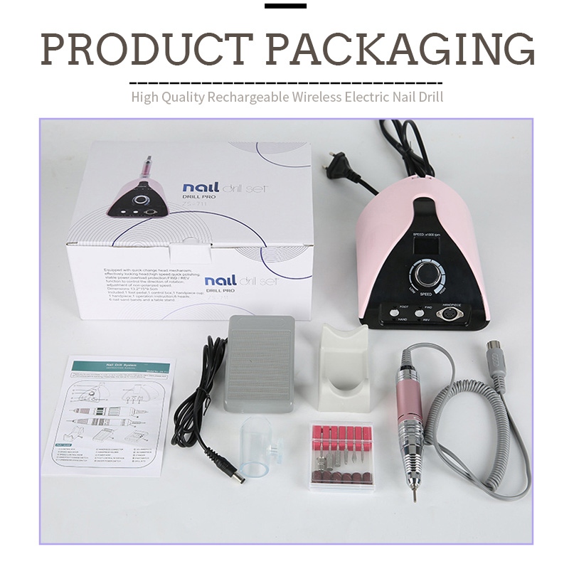 Okuqukethwe kwalo mshini wochwepheshe ophathwayo wokubhoboza izinzipho ongu-35,000 rpm unomkhiqizo wepeni lesihlabathi, intambo yokushaja ye-USB, imanuwali yemiyalelo yomkhiqizo, nebhokisi elingasindi neliphathekayo.