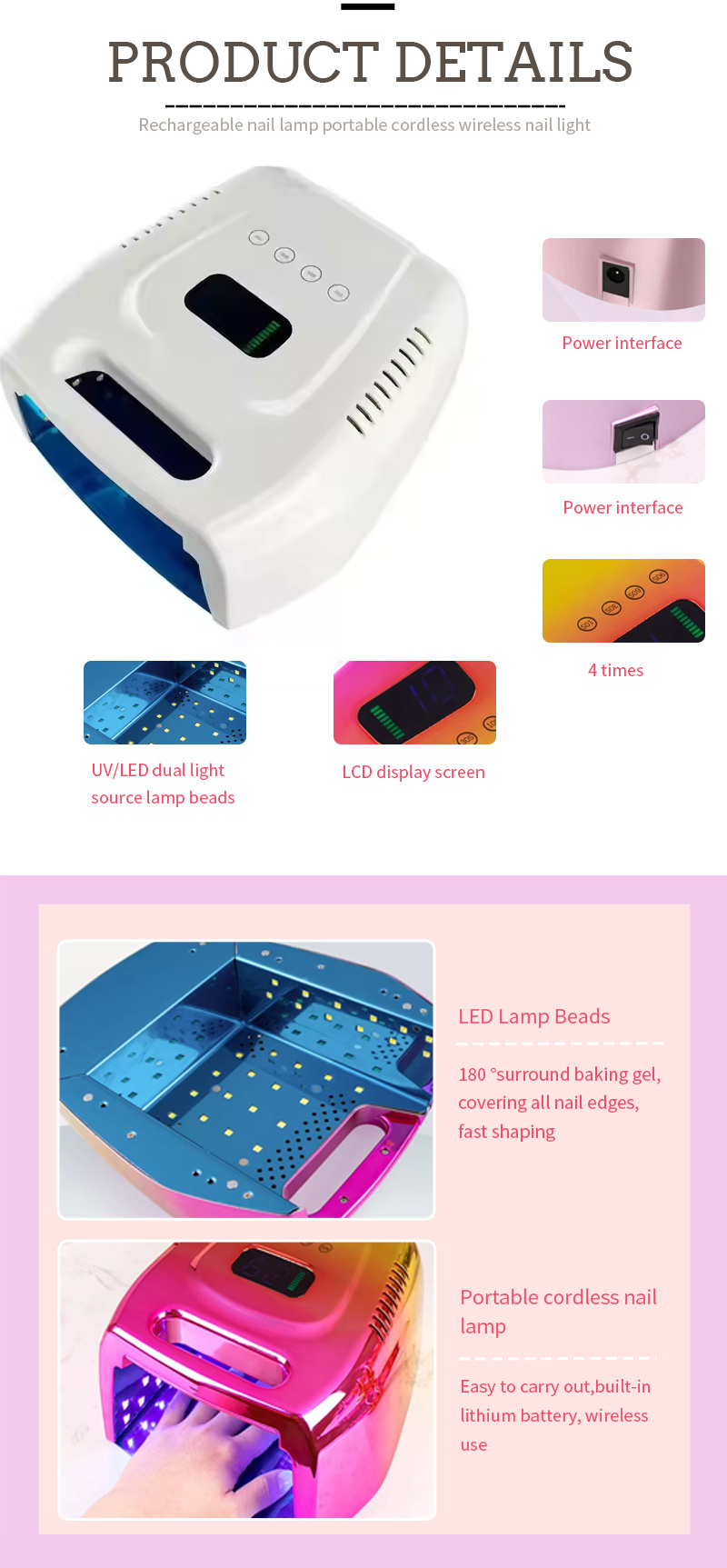 I-Nail Lamp yasePilish Lamp Version engu-160W ukubukeka komkhiqizo inokwakheka kwe-groove, isibambo esise-groove singasetshenziswa njengendima yokuphatha ephathekayo, okwenza kube lula ukuthwala nokubeka. Kubuye kugweme ukungathandeki kwesibambo kuphulwe kalula futhi kwadonswa.