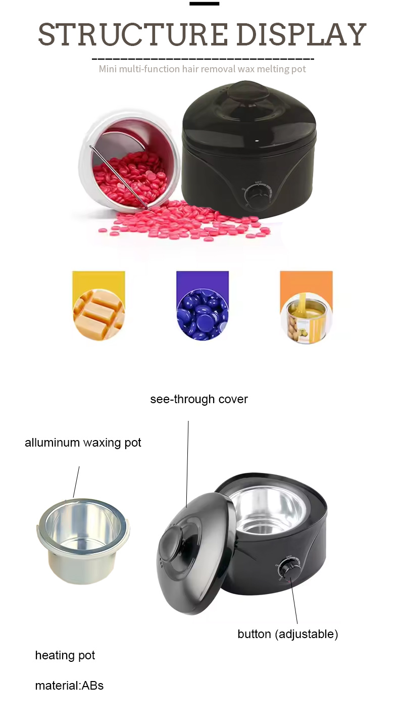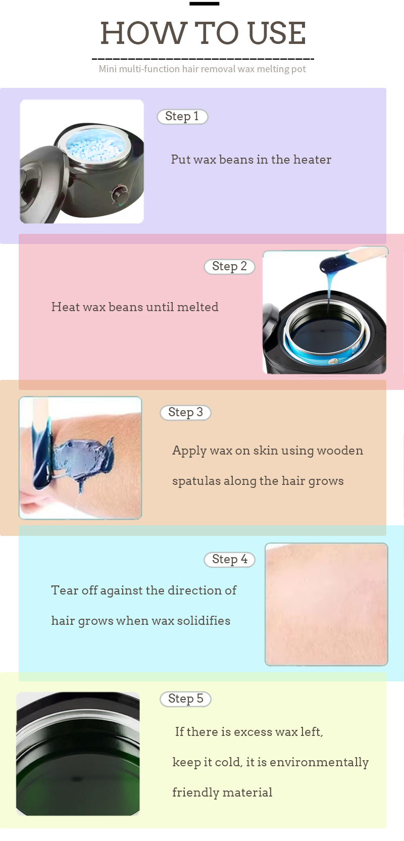 Indlela yokusebenza okudumale komkhiqizo, okuphezulu okushisa okusheshayo kwe-wax kuncibilika, uthele kuqala inani elifanelekile le-wax ubhontshisi, bese ekugcineni uncibilike ngokudumaza okufihlekile, bese ekugcineni ubhekene nendlela yokukhula kwezinwele ehlehlisiwe.